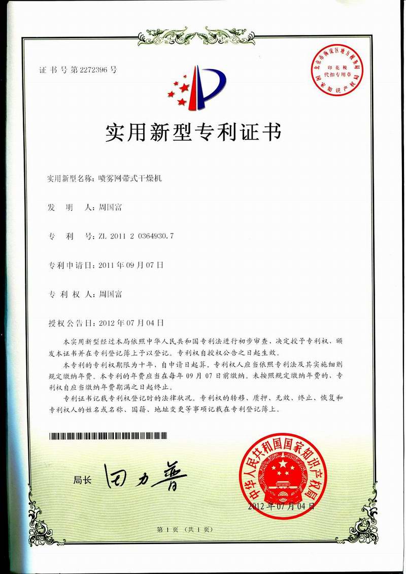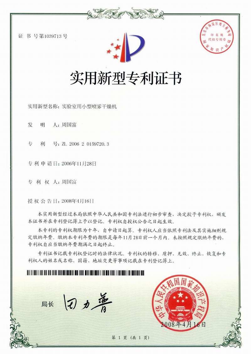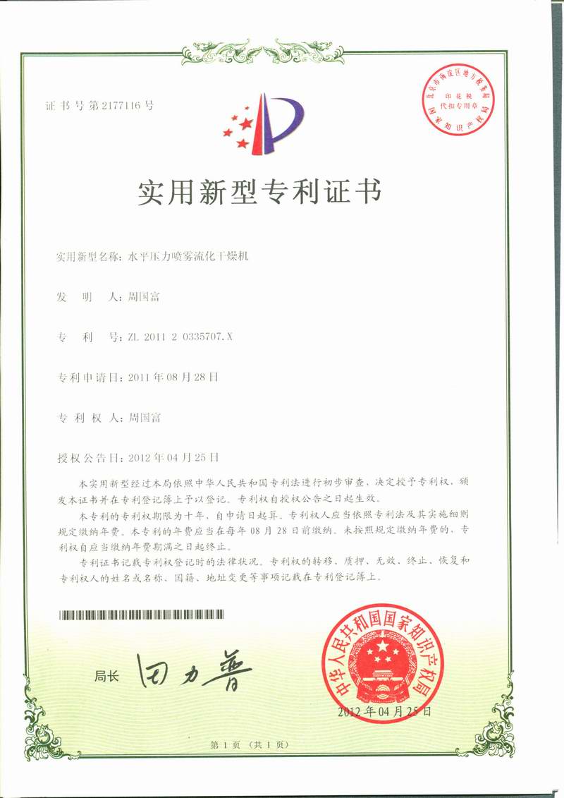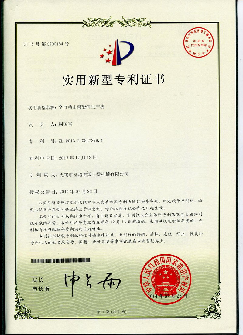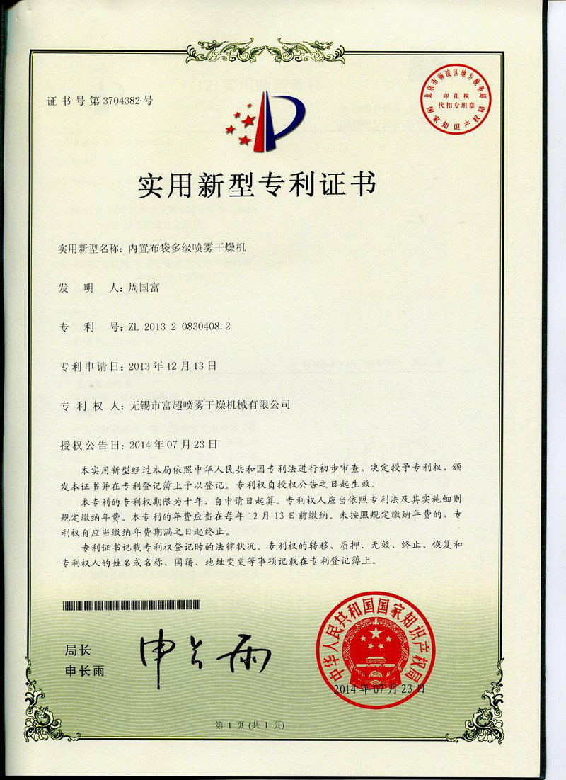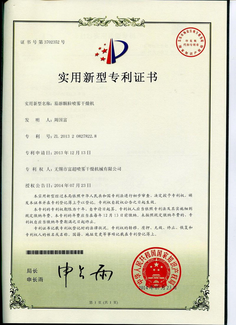 公司通過了ISO9000認證,目前擁有四項專利,在同行中技術處于領先位置。我們的技術是在 用戶不斷提出新的要求通過我們不斷的改進而來的,噴霧干燥嚴格的說七分是經驗積累,三分 是技術。可以說每個用戶提出的要求是不同的,我們會盡量滿足用戶的要求。沒有最好只有更 好是我們富超公司的產品宗旨。